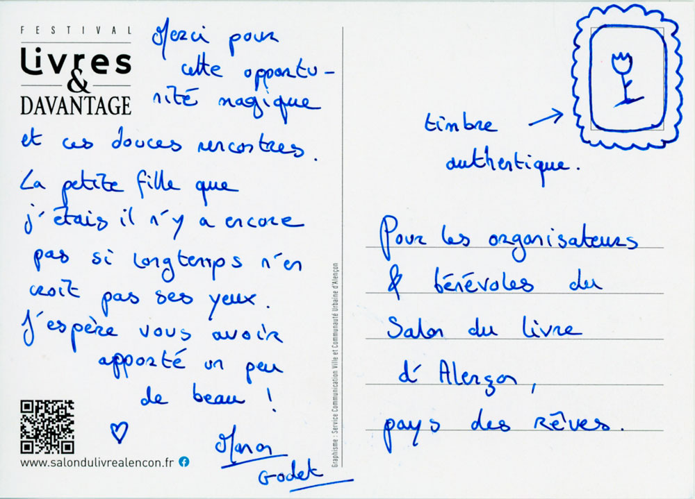 Merci pour votre accueil. Les rencontres avec l’équipe, les autres auteurs et les enfants de la ville furent riches ! J’ai vécu un moment intense et agréable, MERCI !!